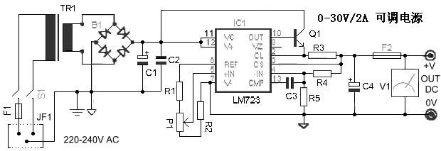 此電路用一片電壓調(diào)壓專用電路LM723(IC1)為核心,調(diào)節(jié)P1可實(shí)現(xiàn)輸出電壓從0-30V連續(xù)可調(diào),Q1為電流驅(qū)
