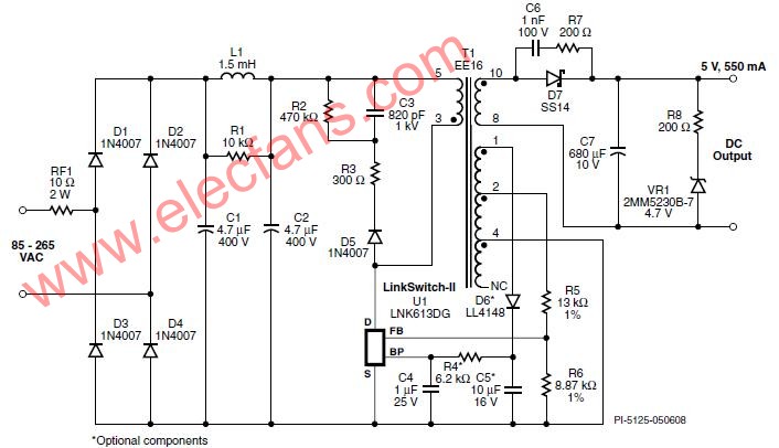 圖1所示為2.75 W恒壓/恒流(CV/CC)通用輸入充電器電源的電路圖,該設計采用了Power Integrations的LinkSwitch系列產(chǎn)品LNK613DG。這種設計非常適合手機或類似的USB充電器應用,包括手機電池充電器、USB充電器或任何有恒壓/恒流特性要求的應用。