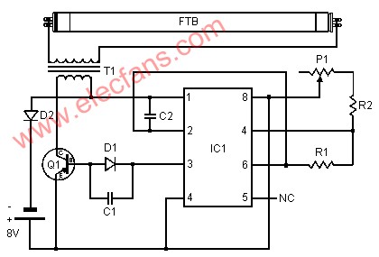 This circuit is a simple ultraviolate light that can be powered by a 6 volt battery or power supply that is capable of supplying 1 or more amps.