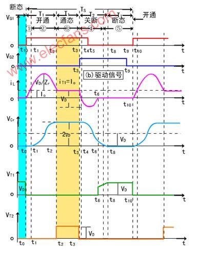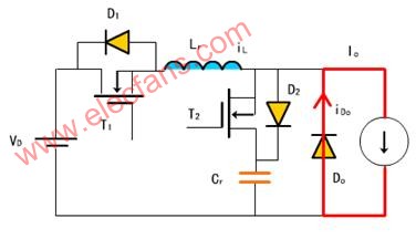 拓撲結構:Buck DC/DC ZCS PWM變換器。主開關T1(包含反并聯(lián)二極管D1),輔助二極管T2(D2是T2的反并聯(lián)二極管)。