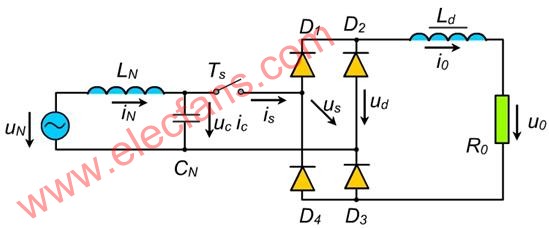電路為電流型整流電路,該電路與單象限降壓型電路(BUCK電路)在拓?fù)渖鲜诸愃疲瑸榱诉m應(yīng)交流電源的性質(zhì),圖中Ts為雙向可控開關(guān),并用D1-D4組成的單相橋式電路代替并聯(lián)的續(xù)流二極管。
