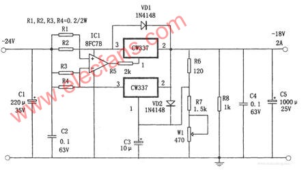 CW337組成并聯(lián)擴流的-18V、2A電源電路