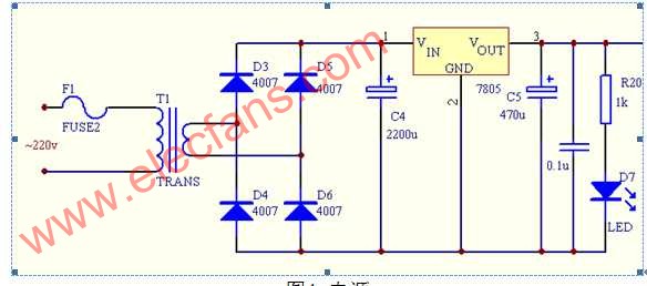 該電路輸入家用220v交流電,經(jīng)過全橋整流,穩(wěn)壓后輸出穩(wěn)定的5v直流電。