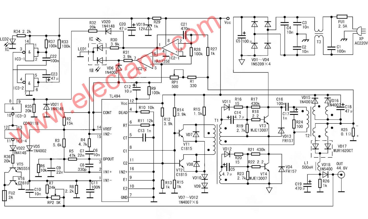 來恢復正常功能的,要想維修48V電動車充電器就必須先了解電動車充電器電路圖及原理,下面就常用的TL494集成電路介紹一下工作原理。