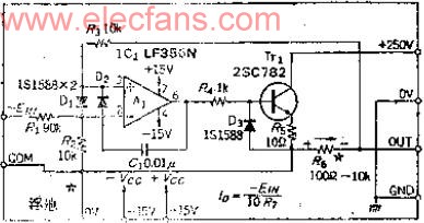 在恒流輸出電路中,如負載電阻增大,使IO.R產(chǎn)生的電壓超過電源電壓,電路就不能在恒狀態(tài)下工作。本電路采用浮地的正負15V和+250V電源,可以獲得大于200V的負載電壓。