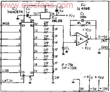 用8位鎖存器保持聲音等數(shù)據(jù)。在靜態(tài)條件下使用時,可把IC1換成作緩沖器用的HC540/1。R-2R梯形電路用作地進制D-A轉(zhuǎn)換,如果電源電壓為5V,可獲得0~4.98V的電壓輸出。
