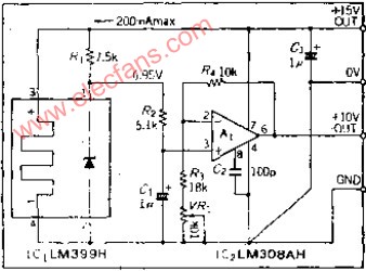 齊納二極管的置偏電流為1MA~10MA,為了用1MA,R1=7.5K,其動態(tài)電阻為0.5歐,如果置偏電流增加1MA,齊納電壓提高500UV,所以必須采用穩(wěn)定的+15V電源。