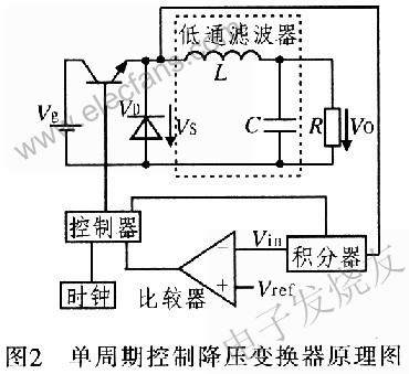 為對單周期控制技術(shù)進(jìn)行說明,現(xiàn)以單周期控制降壓變換器為例進(jìn)行說明。圖2中,電路工作時(shí),由控制器以恒定頻率產(chǎn)生開通脈沖開通開關(guān)S,二極管VD的電壓VS經(jīng)積分器后輸出電壓Vinf,當(dāng)Vinf達(dá)到給定電壓Vref時(shí)比較器輸出翻轉(zhuǎn),控制器發(fā)出關(guān)斷信號關(guān)斷開關(guān)S;與此同時(shí),控制器發(fā)出的復(fù)位信號使實(shí)時(shí)積分器復(fù)位至零,為下一周期做好準(zhǔn)備。