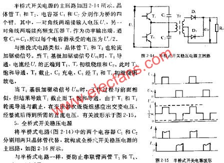 半橋式開關(guān)電源的主回路如圖2-14所示,晶體管T1和T2、電容器C1和C2分別作為橋的四個(gè)臂,其中,一堆角線兩端接輸入電壓C,另一對(duì)角線兩端接高頻變壓器T1作為功率輸出端。