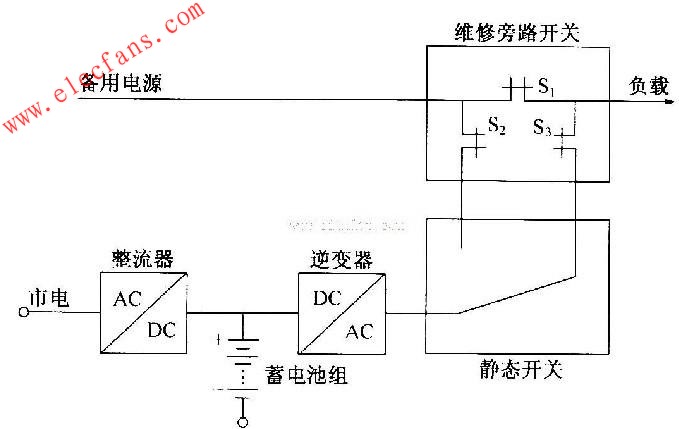 UPS電源依據(jù)逆變器組合方式可分為轉(zhuǎn)換型和并機(jī)型,設(shè)置靜態(tài)開關(guān)的單相轉(zhuǎn)換型UPS電源主電路框圖如圖所示。由圖可知,當(dāng)市電正常時(shí),以逆變器輸出作為主用電源供給負(fù)載。為了便于維修,設(shè)置了一個(gè)手動(dòng)維修旁路開關(guān),即檢修時(shí)先讓旁路開關(guān)S,閉合,然后使S2、S3和靜態(tài)開關(guān)斷開。改由備用電源向負(fù)載供電,則UPS系統(tǒng)與旁路系統(tǒng)脫離,此時(shí)便可對(duì)逆變器、靜態(tài)開關(guān)做維修。當(dāng)逆變器作主用電源時(shí),先合上靜態(tài)開關(guān)和旁路開關(guān)S2、S3,再斷開S1。