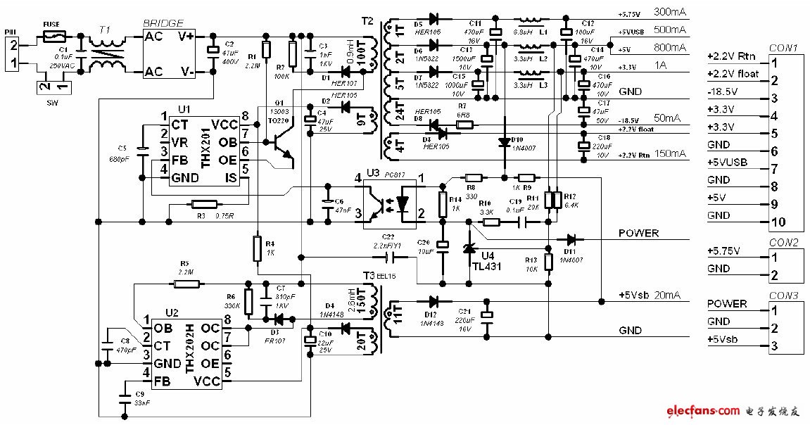 如圖為15W機頂盒開關(guān)電源電路。該多路輸出開關(guān)電源具有出色的交叉調(diào)整率,兩路輸出加權(quán)穩(wěn)壓。