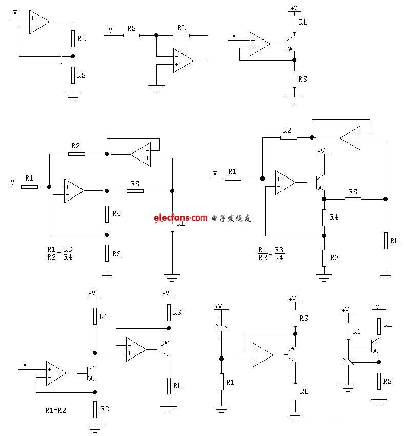 第五種和第四種原理相同,只是擴(kuò)大了電流的輸出能力,人們在使用中常常把電阻R2取的比負(fù)載RL大的多,而省略了跟隨器運放;