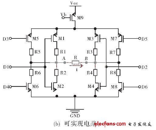 圖中引用的是單電流源模式的驅(qū)動(dòng)電路。在此單電流源模式中, PMOS 管M5 和M6 構(gòu)成一個(gè)電流鏡, 它可以為輸出電路提供恒定電流。適當(dāng)調(diào)節(jié)它們的尺寸, 可使電流源輸出3.45mA 的電流。傳統(tǒng)