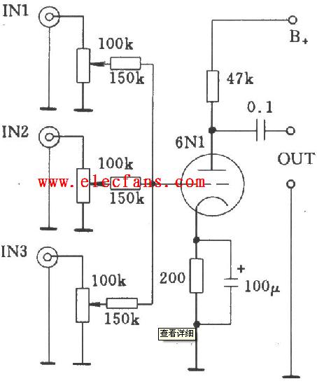 此電子管前級電路見圉l。主拓寬電路選用兩綴共阻投拓寬,輸人級Vl用高頻雙三極管6N3作電壓拓寬,拓寬后的音頻信號送至輸出級v2 V2是將四極管6V6GT接成三極管的辦法,四極管接成三極管運用,盡管