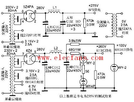 膽整流穩(wěn)壓電路圖:元件有5z3p 6n9p 6j8p 6n5p