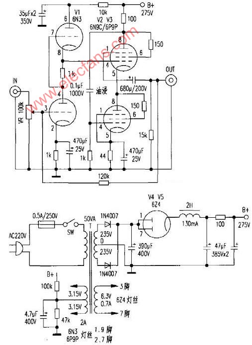 ??? 電源采用分體式雙電源,兩臺以前生產(chǎn)的無廠牌、無標(biāo)示的45W六燈電源牛提供強(qiáng)勁功率,筆者應(yīng)用這種電源變壓器,制成了多臺雙電源耳機(jī)放大器。效果都令人非常滿意。而且,這種變壓器目前售價較低。兩臺不到40元,與現(xiàn)在市面上“缺斤短兩 的變壓器相比,實(shí)在是非常超值。由于六燈變壓器使用電子管整流.輸出電壓不能達(dá)到要求,因此,先使用了1N4007二極管整流升壓,然后用6Z4作為二次整流和軟屆動,再經(jīng)過電容扼流圈濾波,即可得到所需要的電壓。