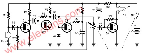 The heart of the circuit is a constant-volume control amplifier. All the signals picked-up by the microphone are amplified at a constant level of about 1 Volt peak to peak. In this manner very low amplitude audio signals are highly amplified and high amplitude ones are limited. This operation is accomplished by Q3, modifying the bias of Q1 (hence its AC gain) by means of R2.