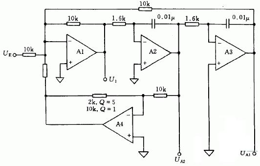 電路有兩路輸出UA1和UA2前者為高通濾小器輸出,后者為帶通濾波器輸出。運(yùn)算放大器A1,A2,A3,A4可以采用四運(yùn)算放大器OP-11FY或LM124。電容應(yīng)采用聚苯已烯薄電容,其精度應(yīng)在正負(fù)10%以內(nèi)。