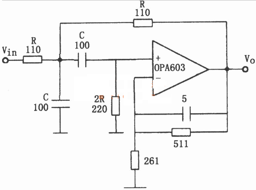 如圖所示為低Q值高增益帶通濾波電路。在運算放大器中加上多路反饋可以構(gòu)成高增益低Q值