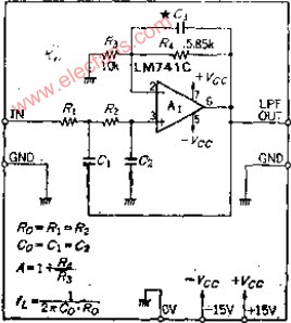 “由OP放大器構(gòu)成的12DB/OCT低通濾波器”介紹的低通濾波器為保證獲得0.707的Q值而造成各電容器的容量不一致,按計算的容量選取電容非常困難。本電路C1、C2的電容量相同,截止頻率一旦確定,即可選取CO=C1=C2的合適值,然后反算RO所需的阻值。