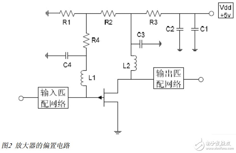 放大器的偏置電路如圖2所示。 圖2中電感 L1和 L2是射頻扼流圈 (RFC) ; 電容 C1-C4為電源濾波電容。