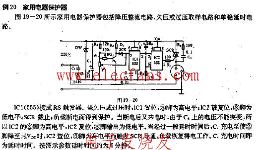 家用電器保護(hù)器:此電路包括降壓整流電路,欠壓或過壓取樣電路和單穩(wěn)延時電路。