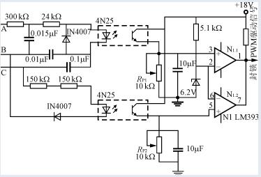 這是一種用于三相三線制電源缺相保護(hù)電路,A、B、C缺任何一相,光耦器輸出電平低于比較器的反相輸入端的基準(zhǔn)電壓,比較器輸出低電平,封鎖PWM驅(qū)動信號,關(guān)閉電源。比較器輸入極性稍加變動,亦可用高電平封鎖PWM信號。