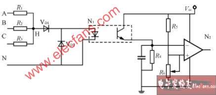 對于使用三相交流電的用電設(shè)備,一個最基本的可靠性保護功能就是三相輸入缺相檢測功能,當三相輸入中任何一相電壓缺相時,該電路模塊輸出缺相告警信號。通過對告警信號的處理,保證了對用電設(shè)備的安全保護。