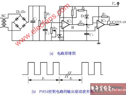 圖8是利用電流傳感器進(jìn)行過(guò)流檢測(cè)的IGBT保護(hù)電路,電流傳感器(SC)初級(jí)(1匝)串接在IGBT的集電極電路中,次級(jí)感應(yīng)的過(guò)流信號(hào)經(jīng)整流后送至比較器IC1的同相輸入端,與反相端的基準(zhǔn)電壓進(jìn)行比較,IC1的輸出送至具有正反饋的比較器IC2,其輸出接至PWM控制器UC3525的輸出控制腳10。不過(guò)流時(shí),VA