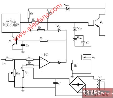下圖是利用IGBT過流集電極電壓檢測(cè)和電流傳感器檢測(cè)的綜合保護(hù)電路,電路工作原理是:負(fù)載短路(或IGBT因其它故障過流)時(shí),V1的Vce增大,V3門極驅(qū)動(dòng)電流經(jīng)R2,R3分壓器使V3導(dǎo)通,IGBT柵極電壓由VD3所限制而降壓,限制IGBT峰值電流幅度,同時(shí)經(jīng)R5C3延遲使V2導(dǎo)通,送去軟關(guān)斷信號(hào)。另一方面,在短路時(shí)經(jīng)電流傳感器檢測(cè)短路電流,經(jīng)比較器IC1輸出的高電平使V3導(dǎo)通進(jìn)行降柵壓,V2導(dǎo)通進(jìn)行軟關(guān)斷。