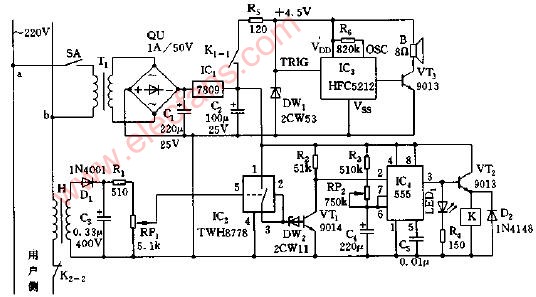 聲光控制延時節(jié)能電燈電路圖,延時節(jié)電燈電路包括聲控,光控傳感元件,放大器和由555構(gòu)成的單穩(wěn)態(tài)時電路及降壓整流電路.