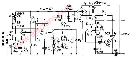 分檔定時插座電路圖 :由時基芯片NE555組成.