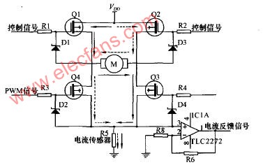 為實(shí)現(xiàn)電動(dòng)機(jī)的正、反兩個(gè)方向的轉(zhuǎn)動(dòng),傳統(tǒng)的電機(jī)驅(qū)動(dòng)電路一般都采用大功率的VMOS管構(gòu)成H橋電路。VMOS管有N溝道和P溝道之分,由于制造工藝方面的原因,P溝道的VMOS管通過的電流較小,因此,一般采用4個(gè)N溝道的VMOS管構(gòu)成H橋電路(如圖1所示)。