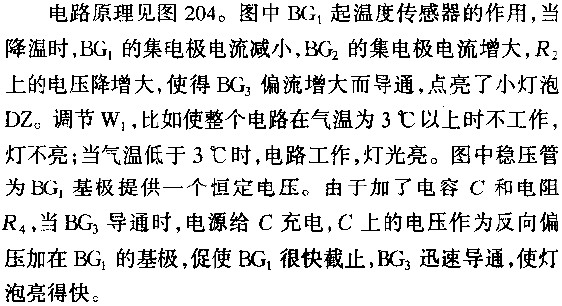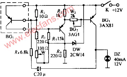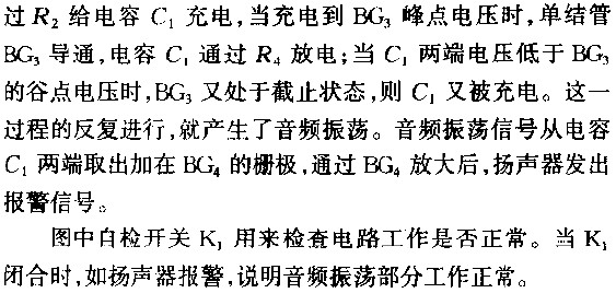 報(bào)警電路見(jiàn)圖203。圖中兩個(gè)金屬板作為檢查火焰的兩個(gè)電極。沒(méi)有火焰時(shí),兩個(gè)電極間絕緣,這時(shí)場(chǎng)效應(yīng)管BG1的柵極經(jīng)由20兆歐電阻接地,而漏極電流在源極10千歐電阻上產(chǎn)生的壓降作為場(chǎng)效應(yīng)管的柵偏壓加在柵極。這時(shí)場(chǎng)效應(yīng)管工作在負(fù)柵壓狀態(tài),漏極電流不大,因此穩(wěn)壓管不導(dǎo)通晶體管BG2不導(dǎo)通,繼電器不吸動(dòng);當(dāng)沒(méi)火焰時(shí),兩電極
