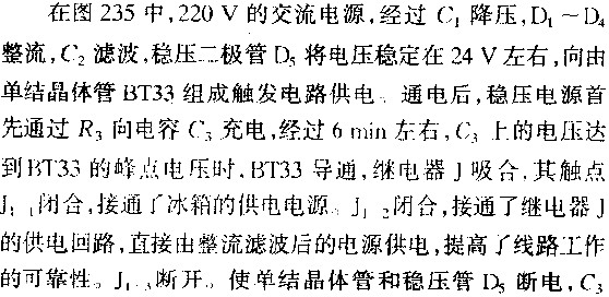 電冰箱斷電保護器:電路可使電冰箱在每次開機后延時5分鐘左右才獲電工作,避免了斷電后又立即通電對電冰箱帶來的危害。