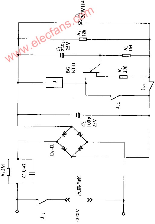電冰箱暫時斷電保護器:能延長冰箱壽命,本電路由降壓整流電路,延時電路和可控硅電路組成。