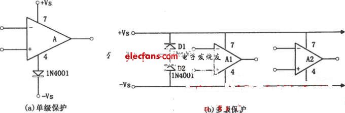 ???????保護(hù)運(yùn)放電源電壓極性反接措施及其電路圖:既有單極的也有多級(jí)的放大電路保護(hù)圖,保護(hù)因電源電壓極性反接導(dǎo)致的流過二極管的電流較大而燒壞二極管。?????????????????????????????????????????????????????????????????