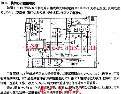 裝飾彩燈控制電路圖,本控制電路以集聲光驅(qū)動(dòng)電路MP1826為核心組成。具有功能多,元件少,費(fèi)用低,彩燈狀態(tài)各異,變化多樣,絢麗多彩等優(yōu)點(diǎn)。