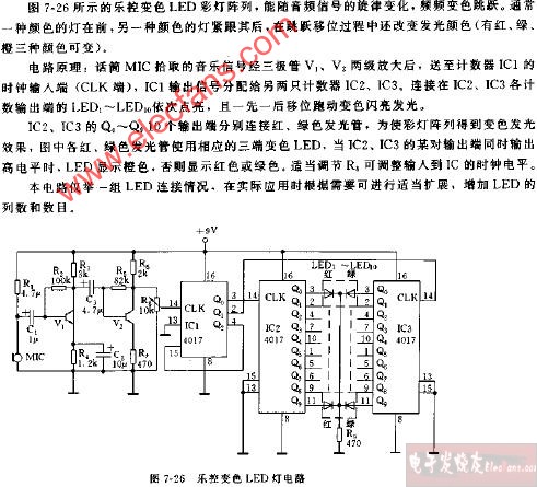 聲控led燈電路圖主要由撿音器(駐極體電容器話筒),晶體管放大器和發(fā)光二極管等構(gòu)成。靜態(tài)時(shí),VT1處于臨界飽和狀態(tài),使VT2截止,LED1和LED2皆不發(fā) 光,R1給電容話筒MIC提供偏置電流,話