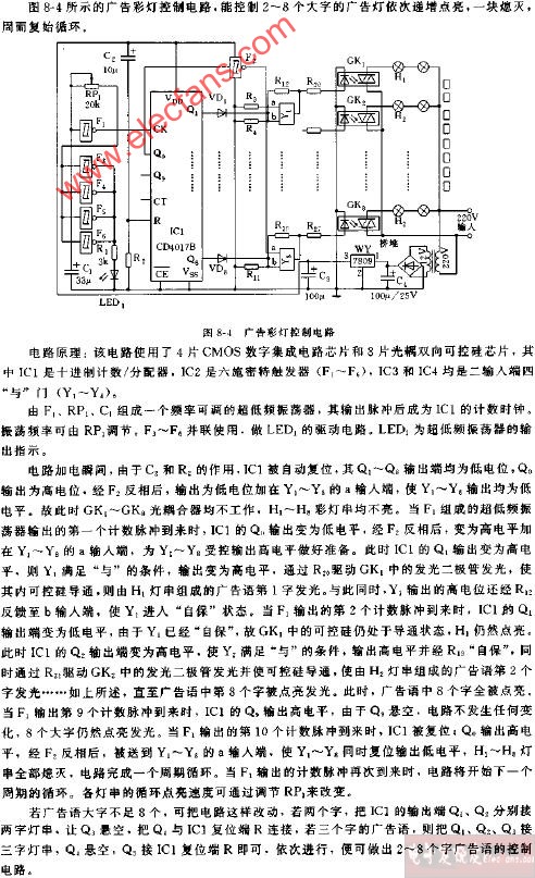 彩燈控制電路可控制6KW的彩燈,具有控制功率大,耦電省,壽命長,噪聲低,工作可靠等優(yōu)點。適用于大型廣告,燈展,舞廳,劇場等裝飾之用。