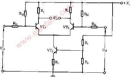 電路采用恒流源代替RE,其等效電阻大,抑制共模信號、零漂能力強(qiáng),又不需要過大的負(fù)電源UEE。