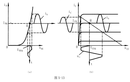 圖解法的分析步驟是:在三極管輸入特性曲線(xiàn)上,畫(huà)出輸入信號(hào)的波形,根據(jù)輸入信號(hào)波形的變化情況,在輸出特性曲線(xiàn)相應(yīng)的地方畫(huà)出輸出信號(hào)的波形,并分析輸出信號(hào)和輸入信號(hào)在形狀,幅度,相位等參量之間的關(guān)系,如圖5-10(a)、(b)所示。