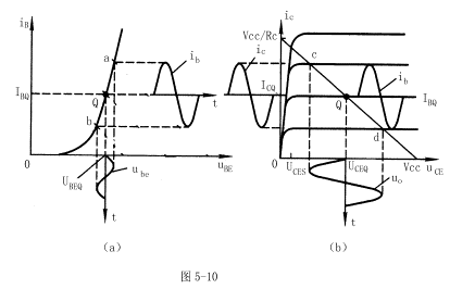 當(dāng)輸入是ui>0的正半周信號(hào)時(shí),放大器輸入端的工作點(diǎn)沿輸入特性曲線(xiàn)從Q點(diǎn)往a點(diǎn)移,放大器輸出端的工作點(diǎn)沿直流負(fù)載線(xiàn)從Q點(diǎn)往c點(diǎn)移,在輸出端形成uo<0的負(fù)半周信號(hào);當(dāng)輸入是ui<0的負(fù)半周信號(hào)時(shí),放大器輸入端的工作點(diǎn)沿輸入特性曲線(xiàn)從Q點(diǎn)往b點(diǎn)移,放大器輸出端的工作點(diǎn)沿直流負(fù)載線(xiàn)從Q點(diǎn)往d點(diǎn)移,在輸出端形成uo>0的正半周信號(hào)。完成對(duì)正、負(fù)半周輸入信號(hào)的放大,如圖5-10所示。