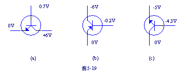 圖5-18(c)最低電位點(diǎn)是-5V,最高電位點(diǎn)是0V,中間電位點(diǎn)是-4.3V,說(shuō)明該三極管的電流是從0電位點(diǎn)往-4.3V點(diǎn)流,再流向-5V點(diǎn),與(1)一樣,它是NPN硅管,在電路中NPN硅管發(fā)射極的電位最低,所以-5V點(diǎn)是發(fā)射極c,-4.3V點(diǎn)是基極b。0電位點(diǎn)是集電極c。