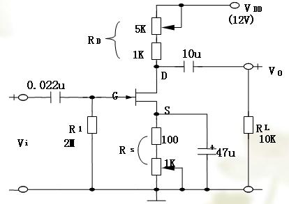 ???? 按上圖接線,調(diào)節(jié)VDD使VDS=5V,然后調(diào)節(jié)RW(10KΩ)