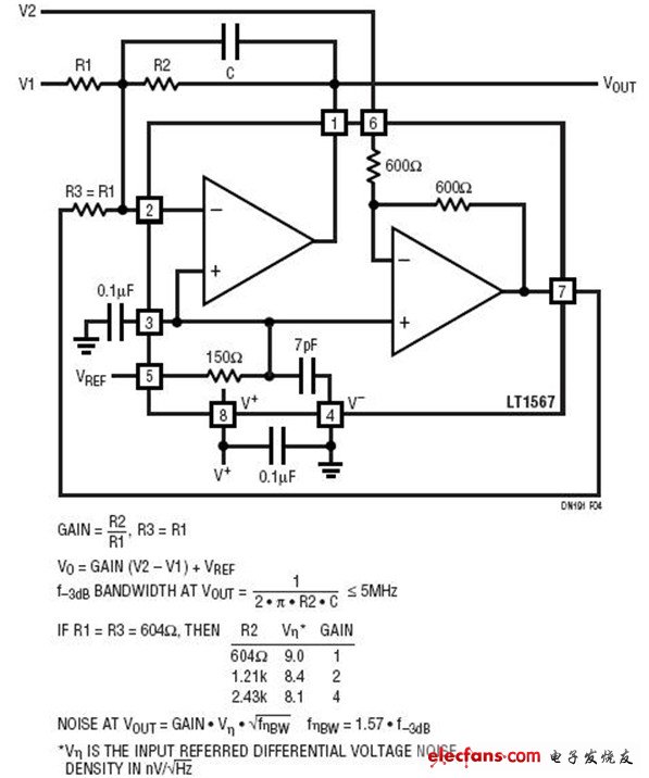 該電路是一款用于將一個差分輸入轉(zhuǎn)換為一個單端輸出的電路。當增益等于 1 時 (R1 = R2 = 604W 和 VOUT = V2 V1),輸入參考差分電壓噪聲為 9nV/Hz,差分輸入信噪比為 80.9dB (對于位于 4MHz 噪聲