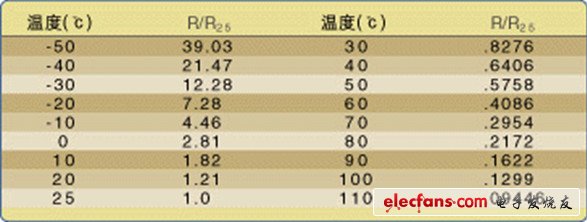 用來測量溫度的傳感器種類很多,熱敏電阻器就是其中之一。許多熱敏電阻具有負(fù)溫度系數(shù)(NTC),也就是說溫度下降時它的電阻值會升高。在所有被動式溫度傳感器中,熱敏電阻的靈敏度(即溫度每變化一度時電阻的變化)最高,但熱敏電阻的電阻/溫度曲線是非線性的?! D1是一個典型的NTC熱敏電阻器性能參數(shù)。