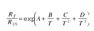 雖然這里的熱敏電阻數(shù)據(jù)以10℃為增量,但有些熱敏電阻可以以5℃甚至1℃為增量。如果想要知道兩點之間某一溫度下的阻值,可以用這個曲線來估計,也可以直接計算出電阻值,計算公式如下: