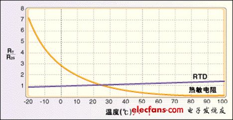 RTD的電阻值以0℃阻值作為標(biāo)稱值。0℃ 100Ω鉑RTD電阻在1℃時它的阻值通常為100.39Ω,50℃時為119.4Ω,圖4是RTD電阻/溫度曲線與熱敏電阻的電阻/溫度曲線的比較。 RTD的誤差要比熱敏電阻小,對于鉑來說,誤差一般在0.01%,鎳一般為0.5%。除誤差和電阻較小以外,RTD與熱敏電阻的接口電路基本相同?! ?br /> 熱電偶