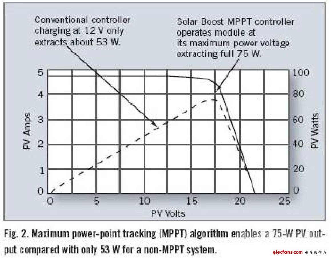 未采用MPPT 算法的逆變器簡單地將光伏模塊與電池直接連接起來,迫使光伏模塊工作在電池電壓。幾乎無一例外的是,電池電壓不是采集最多可用太陽能的理想值。